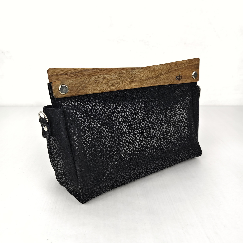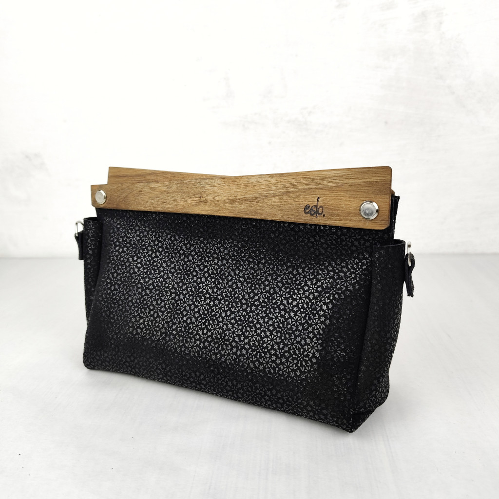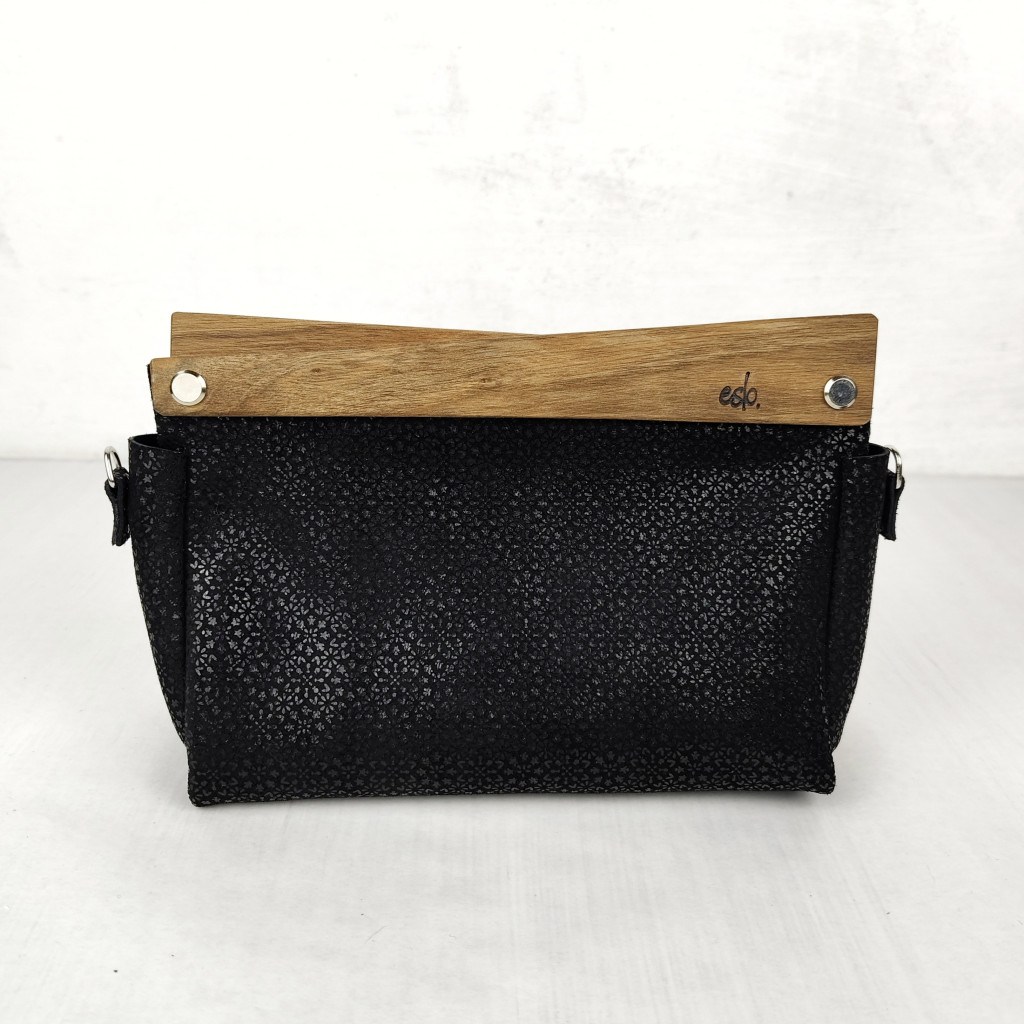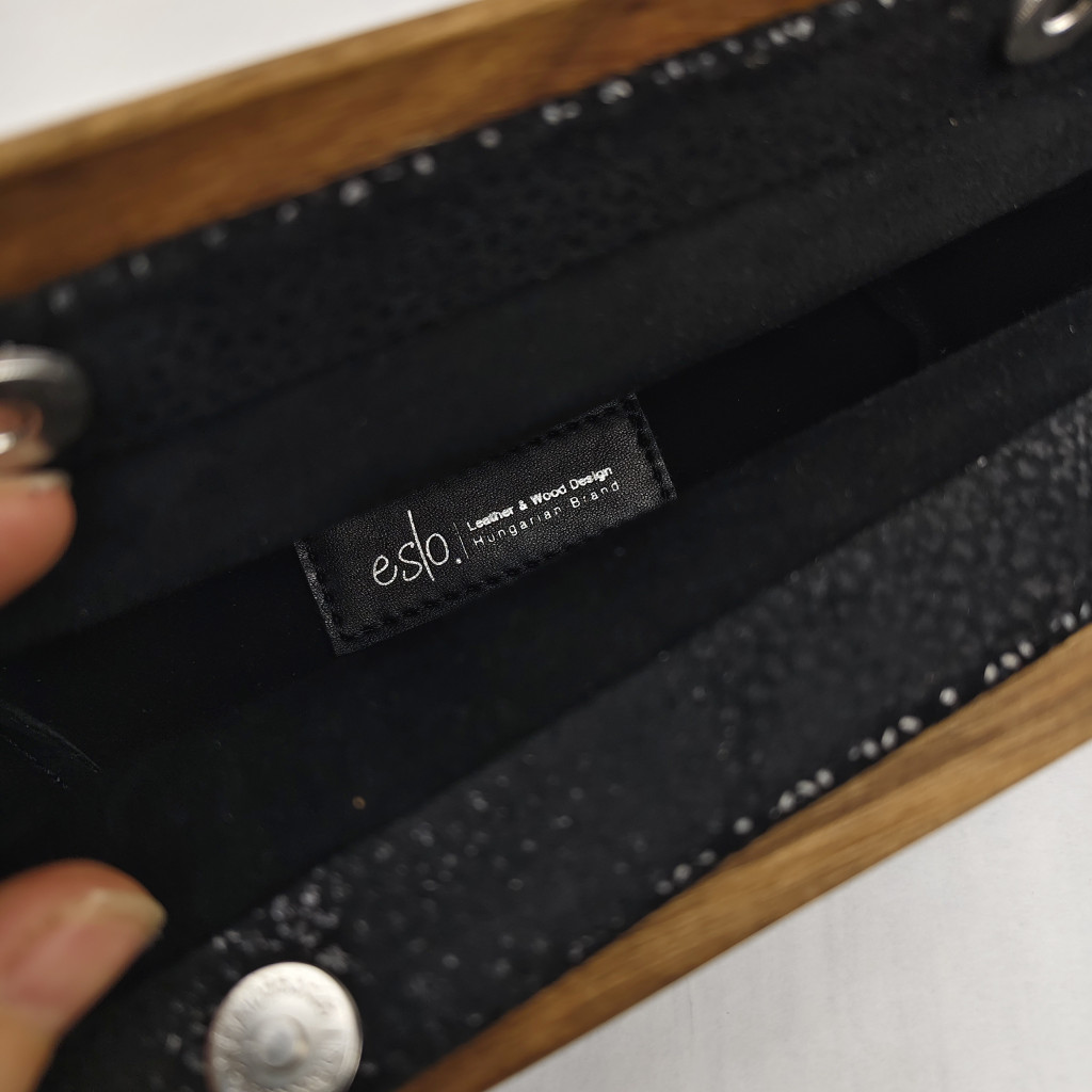 Az ESLO Pipere fekete táska gondosan válogatott marhabőrből, jelen esetben egy hasított, hópehely mintájú, textúrájú marhabőrből és természetes diófából készült. A bőr puhasága és tartóssága a minőséget, míg a diófa meleg tónusai és természetes textúrája az egyediséget garantálja. Ez az anyagkombináció egyszerre sugároz eleganciát és természetességet.