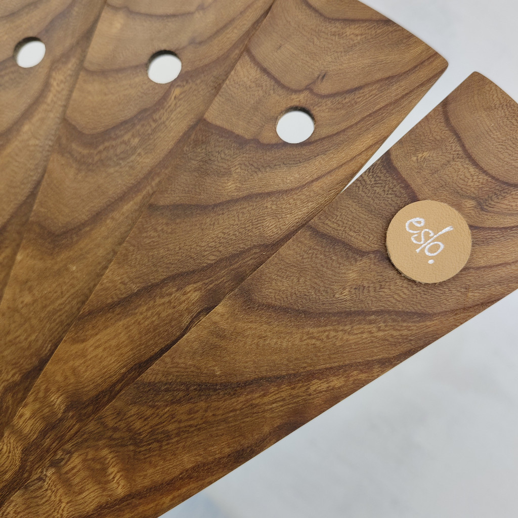 Elrugaszkodtunk a hagyományos értelemben vett legyező sémáktól, es egy "nyitott", papír vagy szövettől mentes koncepciót éreztünk igazán unikálisnak, és ezekhez a fákhoz meltónak. Összecsukva is kifejezetten szépséges, és itt a bőr, csak épphogy megtámogatja a fát. Minden részletet igyekeztünk maximálisan kidolgozni, és, hogy biztosan teljes biztonságban tudhasd a táskádban, egy lenből készült szövetzsákban érkezik hozzád.